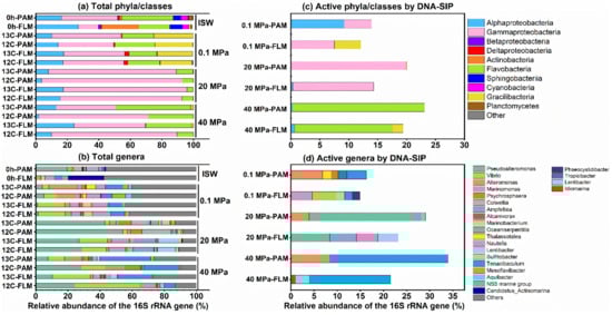 The most abundant total and active PAM and FLM classes and genera (>1% of the relative abundance) for POC utilization at 0.1, 20, and 40 MPa, respectively. (a,b) The total PAM and FLM communities at phylum/class and genus level, respectively. (c,d) Active PAM and FLM taxa identified by DNA-SIP at phylum/class and genus level, respectively.