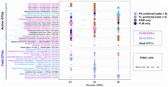 The odds ratio was used to determine the preference of bacteria to the PA or FL lifestyle [54]. Odds ratio > 0 indicates PA preference, whereas odds ratio < 0 represents FL preference. Odds ratios of the total and active bacterial taxa (>1% of relative abundance) at the OTU level and at different pressures are shown in Figure 4.