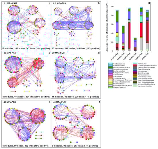 The FLM networks were slightly larger (32 modules), and the 339 nodes in the FLM networks were mainly associated with Proteobacteria (21.8–60.2%), Bacteriodetes (1.1–5.4%), and Verrucomicrobia (0.6–4.9%) (Table 1 and Figure 5g). Similar to the PAM networks, the number of nodes and modules decreased steadily with pressure. However, avgK, avgCC, modularity, and number of links in the FLM networks decreased from 0.1 to 20 MPa, and then increased at 40 MPa, with the smallest GD (3.52) at 40 MPa (Table 1).