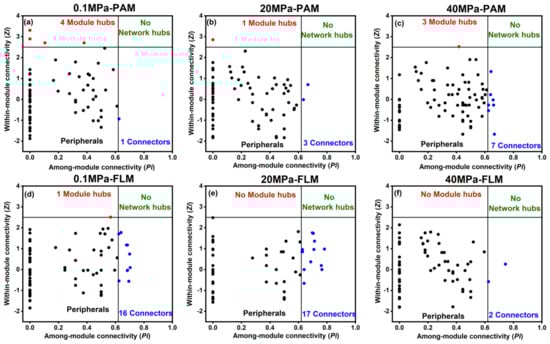 The nodes in the networks were divided into four topological roles based on Zi and Pi values: network hubs (highly connected nodes within entire network, Zi ≥ 2.5, Pi ≥ 0.62), module hubs (highly connected nodes within modules, Zi ≥ 2.5, Pi < 0.62), connectors (nodes that connect modules, Zi < 2.5, Pi ≥ 0.62), and peripherals (nodes connected in modules with few outside connections, Zi < 2.5, Pi < 0.62) [56,57,61,62].