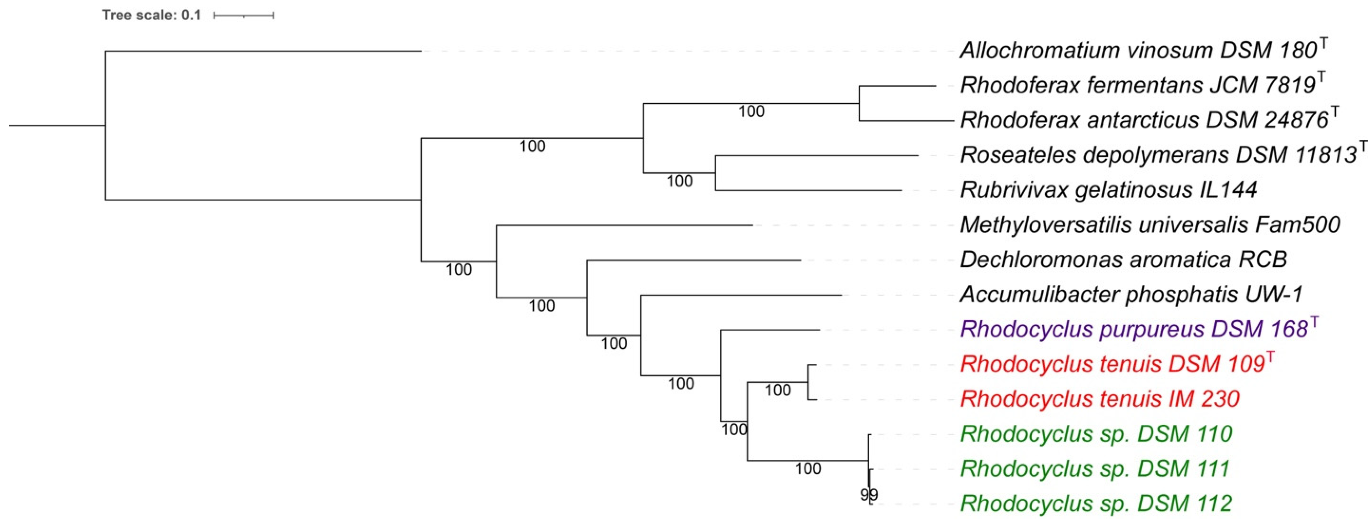 Kyndt JA, Aviles FA, Imhoff JF, Künzel S, Neulinger SC, Meyer TE. Comparative Genome Analysis of the Photosynthetic Betaproteobacteria of the Genus Rhodocyclus: Heterogeneity within Strains Assigned to Rhodocyclus tenuis and Description of Rhodocyclus gracilis sp. nov. as a New Species. Microorganisms. 2022; 10(3):649. https://doi.org/10.3390/microorganisms10030649