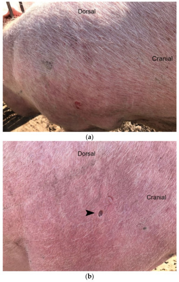 Typical lesions were detected in all examined sows (Figure 1a,b), and the intensity was similar. These clinical signs were observed in diseased animals, especially in periods when stress factors, e.g., after artificial insemination, movement of sows from the dry-period room to the farrowing room 3–7 days before farrowing. The selected animals were characterized by very severe and obvious skin lesions.