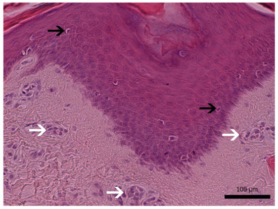 Histopathological findings: severe epidermal hyperplasia with scattered apoptotic bodies (black arrows). Prominent capillaries on superficial dermis (white arrows). H&E stain, magnification ×200 (bar: 100 μm).