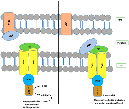 The YfiBNR system consists of three different protein members: (1) an inner membrane diguanylate cyclase (DGC) responsible for the production of c-di-GMP, annotated as YfiN [28,29,30,31]; (2) an outer membrane protein, YfiB [28,29,30,31]; and (3) a periplasmic protein, YfiR, which forms an association between YfiN and YfiB [28,29,30,31]. In the studies conducted in Pseudomonas, it is hypothesized that YfiR allosterically inhibits YfiN by binding to its periplasmic domain and, on the other hand, YfiB positively regulates YfiN’s DGC activity. It does this by sequestering YfiR to the outer membrane, which is accomplished via membrane anchoring and peptidoglycan binding, thereby preventing its binding to YfiN and releasing its inhibition [28,29,30,31,32]. When YfiN is active, it leads to stimulation of its DGC activity, which helps in c-di-GMP production, resulting in enhanced biofilm and various other virulence factors [28,29,30,31,32]. The working model for YfiBNR functioning adapted from the P. aeruginosa YfiBNR system, developed by Malone, J.G. et al. (2010) [31], is illustrated in Figure 1.