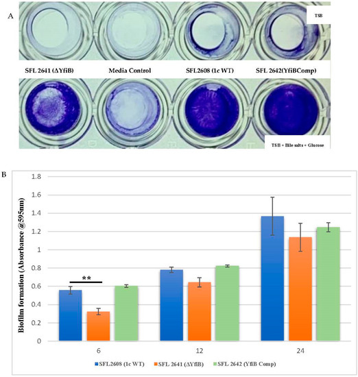 As seen in Figure 3A, biofilm formation remained minimal in the lack of bile salts and glucose, in comparison with a substantial increase of biofilm formation when bile salts and glucose are present. Significantly slower production of biofilm was observed in the yfiB KO mutant SFL2641 (ΔYfiB) when compared to the 1c WT (SFL2608) strain. The biofilm produced by SFL2641 was considerably affected at 6 h of incubation, but it showed no difference to the WT biofilm production at 12 and 24 h. The complemented strain (SFL2642) showed similar amounts of biofilm production as WT and, therefore, it could be concluded that complementing the yfiB gene in the mutant strain reinstates the wild-type function (Figure 3B).
