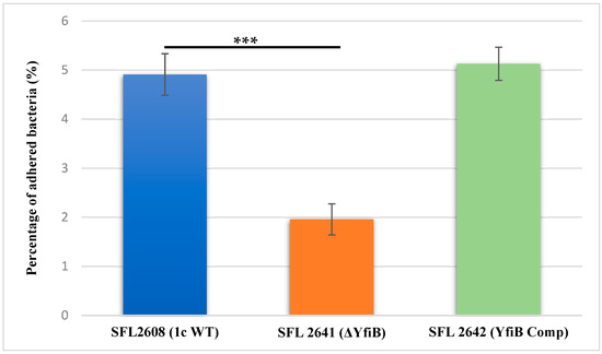 To investigate the involvement of the yfiB gene and yfiBNR operon in the initial attachment or adherence of bacteria to the host cell, an in vitro adhesion assay was performed, in which we infected BHK monolayers with the following Shigella strains: 1c WT (SFL2608), yfiB KO mutant (SFL2641/ΔYfiB), and yfiB complement strain SFL2642 (YfiBComp). The percentage of adhered bacteria for the WT strain (SFL2608) was seen to be 2.5 times higher than the yfiB KO mutant (SFL2641/ΔYfiB). Statistical analysis via an unpaired Student’s t-test confirmed that the yfiB KO mutant had a considerably decreased capacity to adhere to the epithelial cells of the host when paralleled with the wild type (Figure 4). When the yfiB gene was complemented SFL2642 (YfiBComp), it was seen that the wild-type adherence ability was restored. This clearly shows the role of YfiB and YfiBNR system in Shigella virulence, as the very first step of its infection process is adherence to host cells.
