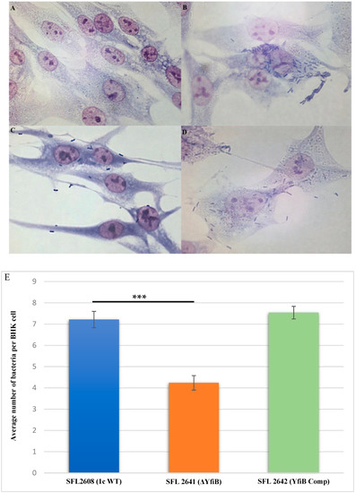 Invasion of BHK cell monolayers by S. flexneri strains. Microscopic images of infected BHK cells, after 2 h post infection at 37 °C and at 5% CO2; Giemsa stain was used to stain the monolayers, and the plates were observed under the microscope. (A) Microscopic image of noninfected BHK cells under 100× oil immersion. (B) Microscopic image of BHK cells infected with the 1c WT (SFL2608) under 100× oil immersion. (C) Microscopic image of BHK cells infected with yfiB KO mutant SFL2641 (ΔYfiB) under 100× oil immersion. (D) Microscopic image of BHK cells infected with yfiB-complemented strain SFL2642 (YfiBComp) under 100× oil immersion. (E) Shigella 1c WT (SFL2608), yfiB KO mutant SFL2641 (ΔYfiB), and yfiB-complemented strain SFL2642 (YfiBComp) were used to infect the BHK cells. The Y-axis represents the number of internalized bacteria per BHK cell after 2 h post-infection at 37 °C/5% CO2. The results were obtained from three independent experiments and were derived from scoring at least 300 BHK cells. To analyze the statistical differences in the invasion, a Student’s t-test was performed. Three asterisks represent that the variance observed was statistically significant (p < 0.001) and standard deviation of data from three autonomous experiments is depicted by the error bars.