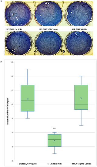 A plaque assay was also performed using HeLa cells to understand the two vital steps involved in the Shigella infection process—invasion and intracellular spread of the bacteria [44]. The number of plaques evaluates the invasive ability of the bacteria, and the size dimensions of the plaques reveals the bacteria’s capability to spread within an epithelium [44,45]. We infected HeLa cells with Shigella strains—1c WT (SFL2608), yfiB KO mutant (SFL2641/ΔYfiB), and yfiB complement strain SFL2642 (YfiBComp), for 48–72 h. It was observed that the number of plaques produced by the yfiB KO mutant SFL2641 (ΔYfiB) was 2.5 times lesser than the 1c WT strain (SFL2608). When the yfiB gene was complemented SFL2642 (YfiBComp), it was seen that the wild-type plaque-forming ability was restored. However, there was no substantial difference observed in the diameters of plaques formed between the strains (Figure 6A,B). A small number of plaques seen in the yfiB KO mutant indicates its inability to adhere to the host cells and disseminate from the initial site of infection, thereby showing significantly less invasion capability compared with the 1c WT strain.