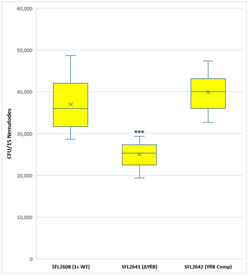 A synchronized population of L4 larva stage hermaphrodite N2 nematodes was prepared and fed with 1c WT (SFL2608), yfiB KO mutant SFL2641 (ΔyfiB), and the yfiB-complemented strain SFL2642 (YfiBComp). Colonization numbers of the wild-type strain were around two folds greater (average CFU/worm) than those of the mutant (average CFU/worm for SFL2641 (ΔyfiB). The average CFU/worm for the complemented strain SFL2642 (YfibComp) was similar to that of the wild type, indicating that the invading ability of the wild-type strain was restored. Statistical analysis confirmed that the accumulation in the C. elegans intestinal lumen by the wild-type strain was considerably higher compared with the yfiB KO mutant (Figure 7).