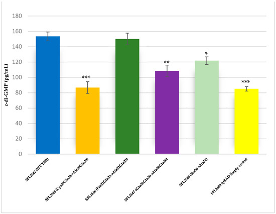 The YfiB site-directed mutant strains showed varied c-di-GMP concentrations, presumably due to the amino acid mutations affecting the functioning of YfiB (Figure 8) [29,30]. The observed c-di-GMP concentrations were: 86 pg/mL in SFL2645 (Cys19Gln20->Ala19Glu20); 150 pg/mL in SFL2646 (Pro22Gln23->Ala22Glu23); 108 pg/mL in SFL2647 (Glu29Gln30->Ala29Glu30); and 121 pg/mL in SFL2648 (Ser36->Ala36). The empty pBAD_Myc_HisA vector strain SFL2650 (SFL2641/ΔYfiB strain containing the empty pBAD_Myc_HisA plasmid) used as a negative control had an 85 pg/mL concentration of native c-di-GMP, which was similar to the KO mutant SFL2641/ΔYfiB strain, as seen in Figure 2).