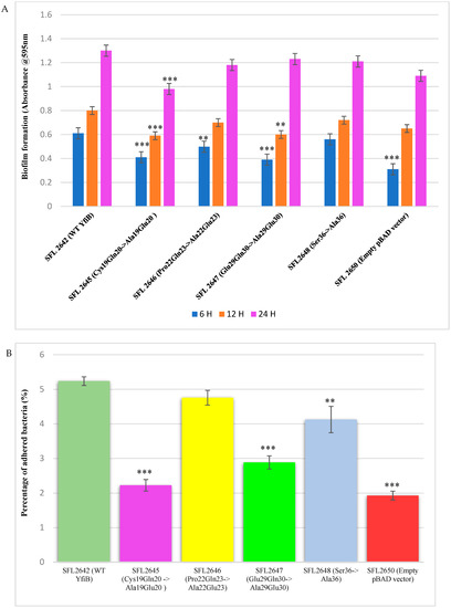 Biofilm formation assay was performed with the wild-type YfiB protein expressing strain (SFL2642), along with the YfiB site-directed mutant strains SFL2645 (Cys19Gln20->Ala19Glu20), SFL2646 (Pro22Gln23->Ala22Glu23), SFL2647 (Glu29Gln30->Ala29Glu30), and SFL2648 (Ser36->Ala36). The empty pBAD_Myc_HisA vector strain SFL2650 was used as the negative control. The assay was performed at 6, 12, and 24 h, and it was observed that there was a noteworthy difference between the biofilm formation of the wild-type YfiB protein and the functional mutants of YfiB (Figure 7). SFL2645 (Cys19Gln20->Ala19Glu20) mutant showed a decrease in biofilm at all three time points, whereas the SFL2646 (Pro22Gln23->Ala22Glu23) and SFL2647 (Glu29Gln30->Ala29Glu30) mutants only showed a decrease in the biofilm produced at 6 and 12 h. The mutant SFL2648 (Ser36->Ala36) displayed only a slight decrease when compared to the wild-type YfiB strain, but this difference was not statistically significant (Figure 9A).