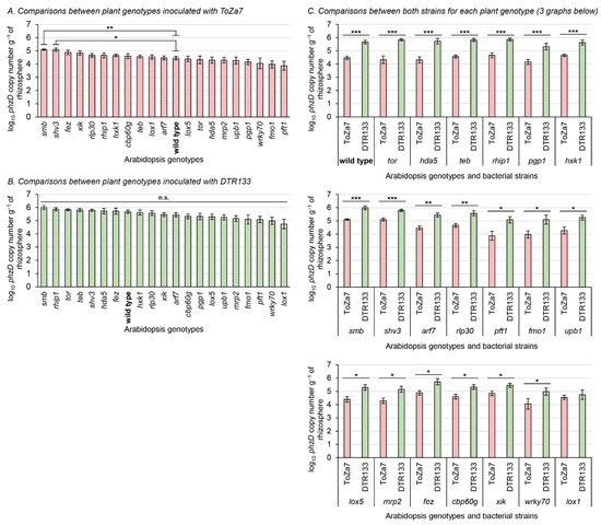 Rhizosphere colonization three weeks following bacterial inoculation with P. chlororaphis subsp. piscium strains ToZa7 and DTR133 for 21 A. thaliana genotypes. Asterisks refer to significant differences between groups. (A,B): nonparametric multiple test procedure for many-to-one comparisons [81], allowing the comparison of all mutants against the wild type. (C): Wilcoxon–Mann–Whitney tests. * p-value < 0.05; ** p-value < 0.01; *** p-value < 0.001; n.s.: non-significant. Bars indicate standard errors (n = 10).