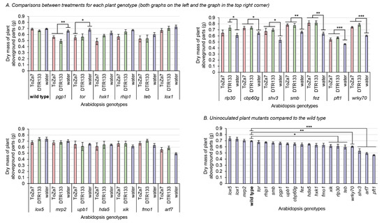 Dry mass of plant aboveground parts three weeks following inoculation with P. chlororaphis subsp. piscium strains ToZa7 and DTR133 for 21 A. thaliana genotypes. Asterisks refer to significant differences between groups defined by Fisher’s least significant difference test. * p-value < 0.05; ** p-value < 0.01; *** p-value < 0.001. Bars indicate standard errors (n = 10). (A) Comparisons between treatments for each plant genotype (graphs have been divided for easy layout). (B) Uninoculated plant mutants compared to the wild type.