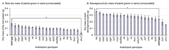 Dry mass of roots and aboveground parts of 21 A. thaliana genotypes grown in sterile sand (not inoculated). Asterisks refer to significant differences between the wild type and another genotype, defined by Fisher’s least significant difference test. * p-value < 0.05. Bars indicate standard errors (n = 3). (A) Root dry mass of plants grown in sand (uninoculated). (B) Aboveground dry mass of plants grown in sand (uninoculated).