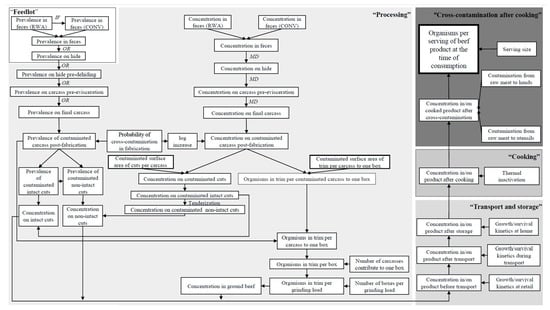 The following supporting information can be downloaded at https://www.mdpi.com/article/10.3390/microorganisms10030661/s1. References [56,57,58,59,60,61,62,63,64,65,66,67,68,69,70,71,72,73,74,75,76,77,78,79,80,81,82,83,84,85,86] are cited in the supplementary materials. Figure S1: Forest plot for eligible studies used to fit the impact factor of BR-EC prevalence between RWA and CONV feces (IF); Figure S2: Forest plot for eligible studies used to fit the transfer ratio of E. coli prevalence from feces to hides at the feedlot in the low-shedding season (L_ORfh_Ecoli_farm); Figure S3: Forest plot for eligible studies used to fit the transfer ratio of E. coli prevalence from feces to hides at the feedlot in the high-shedding season (H_ORfh_Ecoli_farm); Figure S4: Forest plot for eligible studies used to fit the transfer ratio of E. coli prevalence from hides at the feedlot to hides sampled immediately before dehiding in the low-shedding season (L_ORhh_farm_plant); Figure S5: Forest plot for eligible studies used to fit the transfer ratio of E. coli prevalence from hides at the feedlot to hides sampled immediately before dehiding in the high-shedding season (H_ORhh_farm_plant); Figure S6: Forest plot for eligible studies used to fit the transfer factor of BR-EC concentration from feces to hides at the processing plant (MDfh_BR_plant); Figure S7: Forest plot for eligible studies used to fit the transfer ratio of E. coli prevalence from the hide pre-dehiding to the carcass pre-evisceration in the low-shedding season (L_ORhc_hide_carc); Figure S8: Forest plot for eligible studies used to fit the transfer ratio of E. coli prevalence from the hide pre-dehiding to the carcass pre-evisceration in the high-shedding season (H_ORhc_hide_carc); Figure S9: Forest plot for eligible studies used to fit the transfer factor of BR-EC concentration from the hide pre-dehiding to the carcass pre-evisceration (MDhc_BR_hide_carc); Figure S10: Forest plot for eligible studies used to fit the transfer ratio of E. coli prevalence due to evisceration (ORcc_preevis_final). Table S1: Summary of input variables for the “feedlot” module, the distribution/calculation of the input variables and evidence sources; Table S2: Summary of input variables for the cattle compositions, the distribution/calculation of the input variables and evidence sources; Table S3: Summary of input variables for the primary processing of beef carcasses in the “processing” module, the distribution/calculation of the input variables and evidence sources; Table S4: Summary of input variables for the fabrication and trimming of the final carcass in the “processing” module, the distribution/calculation of the input variables and evidence sources; Table S5: Summary of input variables for the production of beef cuts in the “processing” module, the distribution/calculation of the input variables and evidence sources; Table S6: Summary of input variables for the production of ground beef in the “processing” module, the distribution/calculation of the input variables and evidence sources; Table S7: Summary of input variables for the “transport and storage” module, the distribution/calculation of the input variables and evidence sources; Table S8: Summary of input variables for the “cooking” module, the distribution/calculation of the input variables and evidence sources; Table S9: Summary of input variables for the “cross-contamination after cooking” module, the distribution/calculation of the input variables and evidence sources; Table S10: Summary of the estimated parameters of the input variables, log OR and MD, in the quantitative microbial exposure assessment (QMEA) model using the random-effects meta-analysis (MA) approach. Text S1: Fitting the odds ratio (OR) and logarithmic mean difference (MD) to lognormal and normal distributions based on the results from the meta-analysis (MA); Text S2: Fitting the prevalence of BR-EC in RWA feces at the feedlot (Pf_BR_RWA) to a beta-binomial mixture distribution using a hierarchical model.