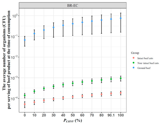 Under the baseline conditions, the estimated average number of BR-EC was 1.7 × 10−4 (95% CI: 1.1 × 10−4–2.4 × 10−4), 8.7 × 10−4 (95% CI: 4.1 × 10−4–1.3 × 10−3), and 6.9 × 10−1 (95% CI: 0–1.7) per serving of intact beef cuts, non-intact beef cuts, and ground beef, respectively.