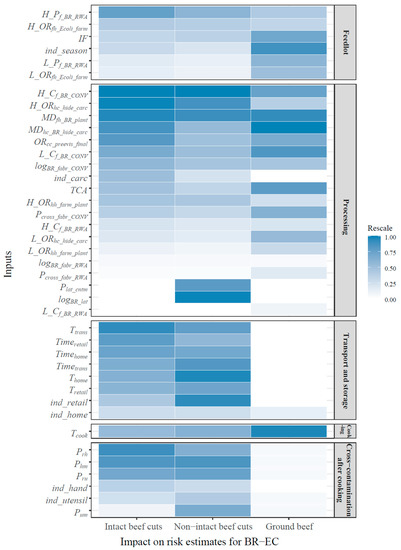 Consumer-related input variables along the supply chain were covered in three modules (Figure 3): “transport and storage” (home storage), “cooking”, and “cross-contamination after cooking”. Higher-ranked variables were refrigeration storage temperature (Thome), time at home (Timehome), internal cooking temperature (Tcook), proportion of organisms transferred from raw meat to hands/utensils (Prh and Pru), and proportion of organisms transferred from contaminated hands/utensils to cooked meat (Phm and Pum). Cooking temperature (Tcook) was significantly important for the exposure estimates of BR-EC in all beef products.