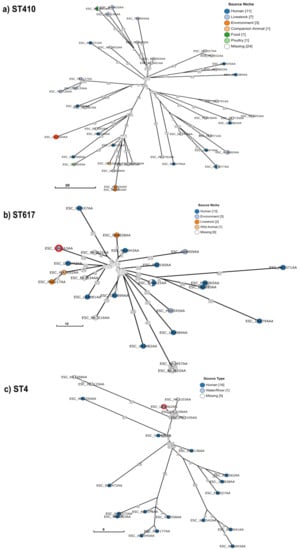 Overall, the global collection of ST410, ST617, and ST4 lineages was predominantly depicted by human-derived isolates, and to a lesser extent, by environment-sourced isolates. Of note, a significant number of isolates in each collection are from unknown origin (Supplementary Figures S1–S3). A similar trend was observed during the examination of refined subtrees. All three sequenced E. coli were clustered with closely related human-derived E. coli isolates (Figure 1a–c).