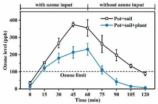 Time courses of ozone level within the sealed chambers. Treatments included pot with soil and pot, soil with E. japonicus, both covered with aluminum foil. The ozone generation lasted for 60 min, and error bars represent standard deviation (n = 3). The dashed line refers to the ozone concentration limit (GB3095-1996).
