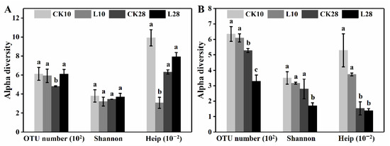 DNA sequences analysis was performed using the free online platform of Majorbio Cloud Platform (www.majorbio.com (accessed on 15 March 2022)). Poor-quality sequences were filtered via FLASH software [24]. The upgraded sequences were clustered into operational taxonomic units (OTUs) with a similarity threshold of 97% on UPARSE [25], supplemented with taxonomic analysis based on SILVA database (Release138, [26]). Alpha diversities at the OTU level were calculated with the online mothur platform (v.1.30.2). The 16S taxonomic lineage was transformed based on the SILVA database [27] into the lineage of prokaryotes in the Kyoto Encyclopedia of Genes and Genomes (KEGG) database [28] to annotate bacterial functions in Tax4Fun. FUNGuild was applied for fungal annotation [29].