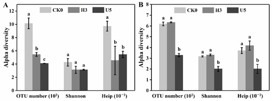 Alpha diversity changes of the bacterial (A) and fungal (B) community in the phyllosphere during the (ultra)high-level ozone exposure. OTU numbers, Shannon and Heip, are shown with error bars representing standard deviation (n = 3). Different letters indicate significant differences (LSD test, p < 0.05).