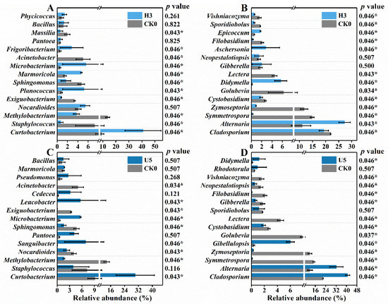 The microbial composition successions in the phyllosphere during the low-level ozone exposure. Bacteria compositional changes after 10 d (A) and 28 d (B) exposure and fungal compositional changes after 10 d (C) and 28 d exposure (D). Error bars represent the standard deviation of replicates (n = 3). p values were calculated by Mann–Whitney–Wilcoxon (MWW) test (* 0.01 < p ≤ 0.05).