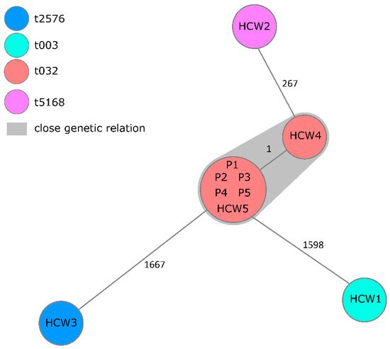 Minimum spanning tree of detected MRSA in chronological order. Minimum spanning tree of five healthcare worker (HCW) and five patient (P) isolates illustrating their genotypic relationship based on up to 1861 cgMLST target genes, pairwise ignore missing values. Every circle represents one genotype, the size of circles correlates with the number of identical genotypes. Color of circles indicates MRSA spa-type. Grey coloring indicates close genetic relation.