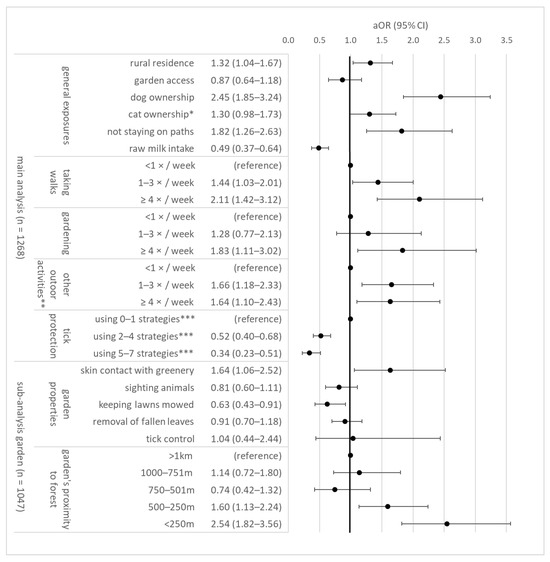 Risk and protective factors for TBE, n = 1268 study participants (538 TBE cases, 730 controls) from Southern Germany. The sub-analysis only included persons with garden access (n = 1047). Estimates represent the total causal effect for each covariate, adjusted for matching factors and covariate-specific minimal adjustment sets of variables (Supplementary Materials Table S1 and Figure S1). For univariable estimates, see Supplementary Materials Table S2. aOR = adjusted odds ratio; CI = confidence interval. * only outdoor cats. ** activities include (in descending frequency): biking, hiking, running/Nordic Walking, other outdoor sport, forestry/logging, bird watching, fishing, hunting, bee keeping. *** regularly applying tick-protective strategies (e.g., tick repellant) during exposure time (cases) or reference time (controls).