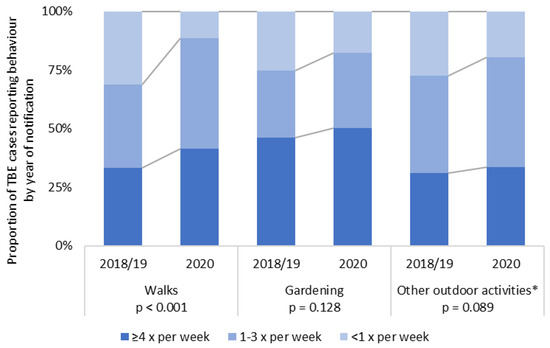 Cases from 2020 reported significantly more frequent outdoor walks than cases from 2018–2019 (Figure 2). There were non-significant tendencies towards more frequent gardening and other outdoor activities in 2020. Other relevant factors from the risk factor analysis did not differ significantly between years (Supplementary Materials Table S4). Hospitalization and symptoms reported in routine data were also similar between years.
