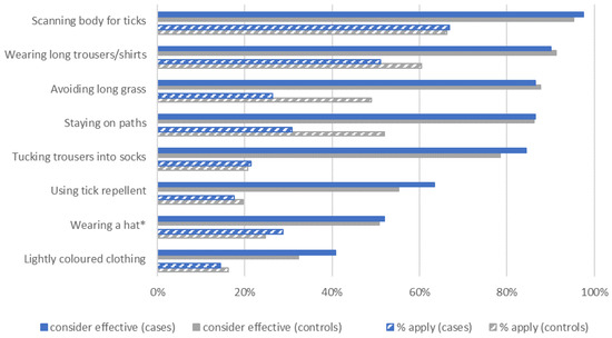 Knowledge of tick-protective strategies was similar in cases and controls (Figure 3). However, markedly more controls reported applying strategies, particularly avoiding long grass and staying on paths (difference to cases: >20%, pChi2 < 0.001), as well as wearing long trousers/shirts (>9% difference, pChi2 < 0.001).