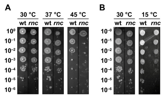We compared growth at different temperatures of a wild-type strain (N3433, referred to as wt) to its rnc105 derivative strain (IBPC633, referred to as rnc) by a droplet plating assay after a short heat shock (15 min at 45 °C). We observed comparable survival at 37 °C and at 30 °C, indicating that the number of viable cells is similar in the wt and rnc mutant (Figure 1A). In agreement with a previous study [38], the rnc mutant showed a decreased survival at 45 °C (Figure 1A). To demonstrate that RNase III inactivation is directly responsible for thermal sensitivity, we used the previously described pRNC1 plasmid, allowing for the ectopic expression of RNase III [29]. In the absence of induction, pRNC1 was shown to drive the expression of around 10% of the wt level and up to a 10-fold overexpression upon induction by arabinose [29]. In the rnc mutant, survival at 45 °C increases upon ectopic expression of RNase III from the pRNC1 plasmid, even in the absence of induction (Figure S1A), suggesting that a low level of wt RNase III is sufficient for phenotypic complementation.