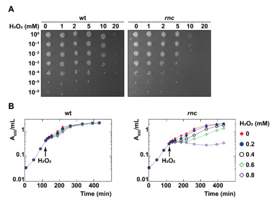 RNase III is required for survival under oxidative stress. (A) Strains wt and rnc were grown until mid-log phase, exposed to H2O2 at the indicated concentrations for 10 min, and survival was assayed by droplet plating. (B) Strains wt and rnc were grown at 37 °C and H2O2 was added to the cultures in mid-log phase, as indicated by a black arrow.