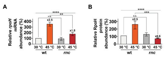 rpoH induction upon temperature upshift is defective in the rnc mutant. Strains wt and rnc were grown at 30 °C and transferred to 45 °C. Total RNA and protein sampled before or after a heat shock were analyzed by northern blot (see Figure S2) and Western blot (see Figure S3). (A) Mean rpoH mRNA levels and (B) mean RpoH protein levels are indicated before (30 °C, in grey) and after (A) 15 min or (B) 5 min of heat shock (45 °C, in red). Values are means of 3 biological replicates and error bars are standard deviations. Statistical significance was determined by ANOVA (n.s. for p-values ≥ 0.05, ** for p-values ≤ 0.01, *** for p-values ≤ 0.001 and **** for p-values ≤ 0.0001).