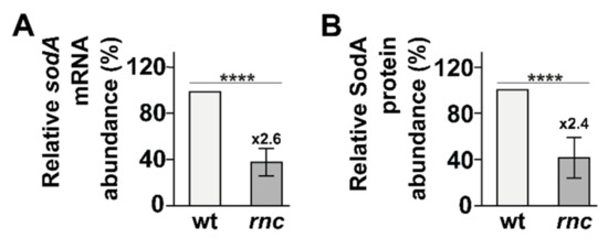 RNase III is involved in the destabilization of the sodB mRNA, encoding the Fe2+-dependent superoxide dismutase B, upon binding by the sRNA RhyB under iron starvation [63]. More recently, the expression of sodA, encoding the major Mn2+-dependent cytoplasmic superoxide dismutase SodA, was observed to be strongly reduced in two independent rnc deletion mutants [31]. Thus, we investigated the role of RNase III in the regulation of sodA and in the resistance to oxidative stress. We first validated that sodA expression is reduced in the rnc mutant in the absence of stress at both mRNA (2.6-fold, Figure 5A and Figure S6) and protein levels (2.4-fold, Figure 5B and Figure S7). Furthermore, we observed that, after 10 min of oxidative stress in the presence of H2O2, sodA expression was slightly reduced at the mRNA level (Figure S6) but not at the protein level in the wt (Figure S7), while RNase III inactivation led to a strong reduction in sodA expression at both mRNA and protein level, similar to what could be observed in the absence of stress. Hence, RNase III is required for the expression of sodA in the absence of and during oxidative stress.