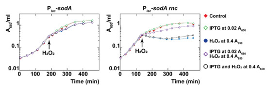 As in the case of sodA expressed from its chromosomal location (Figure 2B), there was little effect of the addition of H2O2 (1 mM) to the wt strain in mid-exponential growth expressing the basal level of SodA from Plac-sodA (Figure 7, left). In the rnc strain, H2O2 immediately stopped growth, and adding IPTG to induce SodA at the same time as the H2O2 challenge was not sufficient for maintaining growth. However, the constant overexpression of SodA from a low cell density was sufficient for maintaining growth after the H2O2 challenge in the rnc mutant (Figure 7, right). In summary, constant SodA overexpression can restore resistance to H2O2 in the rnc strain, suggesting that the RNase III-mediated positive regulation of sodA expression is required to protect against oxidative stress.