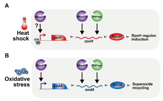 Schematic regulatory roles of RNase III in the adaptation to heat and to oxidative stress. (A) RNase III (purple) and PNPase (green) are required for the induction of rpoH (red) independently from the transcription factors CRP (dark grey) and CytR (grey). (B) RNase III and PNPase are important for the expression of the superoxide dismutase SodA (blue). Positive regulatory events (direct or indirect) are represented by a black arrow.