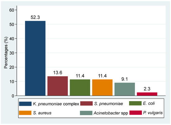 Nearly one-third (i.e., 29.5% (78/264)) of sputum samples showed active inflammation microscopically. Approximately 7.2% (19/264) had positive GeneXpert results for pulmonary TB of which 10.5% (2/19) had a previous history of TB. On the other hand, approximately 16.3% (43/264) had a positive culture with other pathogenic bacteria. Presumptive TB cases were predominantly infected with other pathogenic bacteria than M. tuberculosis, although the difference was not statistically significant (16.3% vs. 7.2%, p = 0.1669). One sample had growth of two other bacteria making a total of 44 isolated bacteria with the predominance of Gram-negative bacteria at 75.0% (33/44). The predominant species isolated was the Klebsiella pneumoniae complex (52.3% (23/44)), followed by S. pneumoniae (13.6% (6/44)), E. coli (11.4% (5/44)), S. aureus (11.4% (5/44)), Acinetobacter spp. (9.1% (4/44)), and P. vulgaris (2.3% (1/44)) (Figure 1). Whereas co-infection of TB and other pathogenic bacteria was observed in 1.1% (3/264), two co-infections with K. pneumoniae complex, and one co-infection with S. aureus (Figure 2).