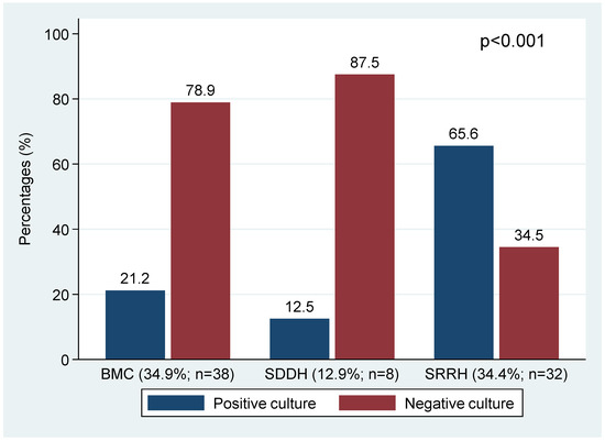 Using Pearson’s chi-square test, other pathogenic bacteria were significantly more present in sputum samples at SRRH than BMC and SDDH (29.1% vs. 12.8% and 3.2%, p < 0.001), and sputum samples with active inflammation significantly predicted a culture positive with other pathogenic bacteria (37.2% vs. 7.5%, p < 0.001) (Table 3 and Figure 3).