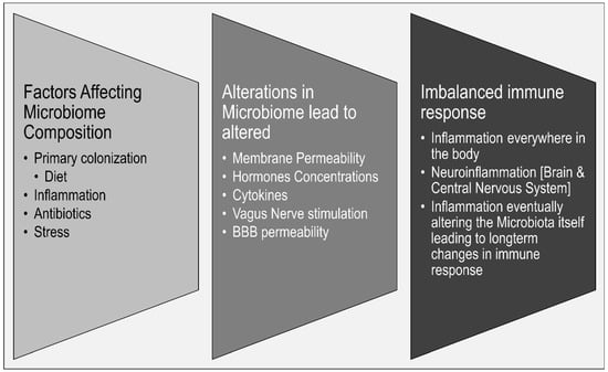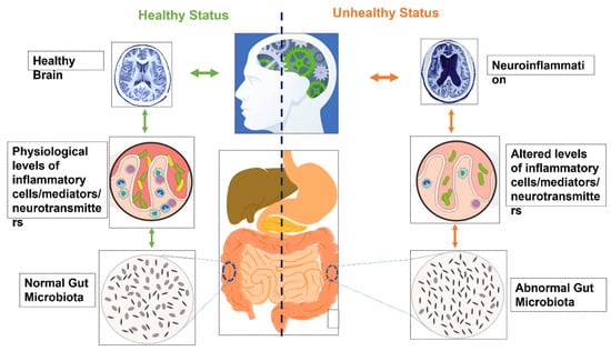 Neuroinflammation is the inflammatory response occurring in the nervous system and involves various immune mediators [2]. The key players of this process are cells and cytokines, mainly microglia. In addition, other immune cells such as endothelial cells and astrocytes also play important roles [3]. Neuroinflammation is a critical physiological process that communicates between the central nervous system (CNS) and the immune system. It plays an essential role in brain development and plasticity, maintenance of synapses, repair processes after spinal cord injury or traumatic brain injury [4]. Neuroinflammation is an integral part of the pathology of neurodegenerative disorders, including Parkinson’s disease (PD), Alzheimer’s disease (AD), functional disorders, major depressive disorder (MDD), bipolar disorder, schizophrenia as well as autoimmune disorders, such as multiple sclerosis (MS) [4]. A host of physical factors governs the occurrence and regulation of neuroinflammation, and the human microbiome is one of the most important ones, as discussed under.