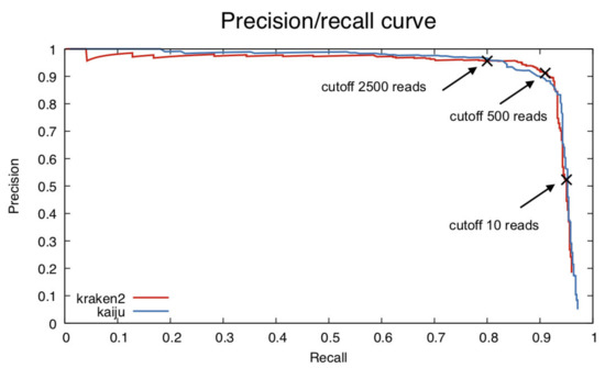 To estimate a good value for a specific abundance threshold, Ye et al. used a precision-recall curve, where each point represents the precision (specificity) and recall (sensitivity) scores at a specific abundance threshold [3]. Here, we calculated a cutoff of minimal reads per species to compare Kraken and Kaiju.