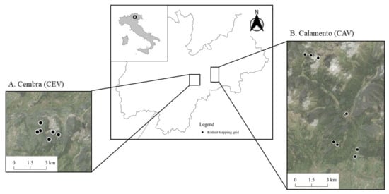 The study was carried out in two sites located in the Province of Trento (Italy): Cembra Valley (CEV; 46.13020 N–11.17843 E, altitude 1000 m a.s.l.) and Calamento Valley (CAV; 46.12092 N–11.48842 E, altitude from 500 to 2500 m a.s.l.) (Figure 1). CEV comprises peri-urban areas with an alternation of small villages and areas of anthropic employment (quarries and forest harvest) and semi-naturalized forests. CAV is instead characterized by the full vegetation succession, from broad-leaf woodland and mixed forest to conifer and stands forest, shrubs, and alpine prairies. The area is relatively undisturbed, with few anthropic activities (traditional cattle husbandry and seasonal tourism). In CEV, small mammal monitoring was performed from 2019 to 2021 at monthly or bimonthly intervals during the winter (November–March) and summer (April, June, and August), respectively, in a mixed broad-leaved and coniferous forest at 1000 m a.s.l. In CAV, live trapping was performed in 2019 and 2020 at monthly intervals during the summer (May–October) along an altitudinal gradient (from 500 m a.s.l. to 2500 m a.s.l.), corresponding to the succession of alpine habitats (i.e., from broad-leaf woodland down the valley up to grasslands above the tree line).