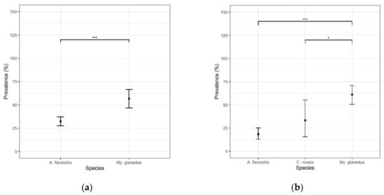 Difference of the prevalence rates of Hepatozoon spp. among rodent species from the Province of Trento, Italy (2019–2021): (a) in Cembra Valley (CEV) and (b) in Calamento Valley (CAV). Vertical bars represent the 95% confidence interval. Horizontal bars refer to significant differences, with *** = significance level < 0.001 and * = significance level < 0.05.