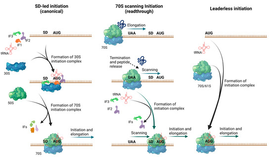 In addition to the canonical mechanism of translation initiation, bacteria can initiate translation through at least two other mechanisms [1]. One is 70S scanning, also called translational coupling or readthrough (Figure 1, center). In this mechanism, the ribosome does not dissociate to 30S and 50S subunits after finishing the translation of a cistron. Instead, it continues to be associated with the mRNA and slides downstream until it reaches a canonical RBS where it can initiate translation. In addition to allowing initiation of genes downstream of canonical genes, 70S scanning allows the initiation of genes located at the beginning of a transcript, as long as the 5′ UTR is unstructured and there are 70S particles available for initiation. Similar to canonical initiation, IF3 is required for this process. By contrast, IF1 is not essential, although it is strongly stimulatory [4,14].