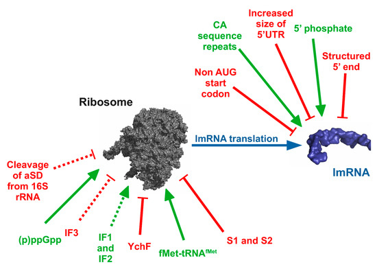 Recent publications have proposed additional possibilities for the modulation of lmRNA translation. Landwehr et al. proposed that YchF ATPase from E. coli inhibits lmRNA translation [44], and we found that (p) ppGpp may activate lmRNAs translation in addition to its known role in the inhibition of canonical translation [41]. Whether these and the previously reported effects are interconnected or not is not known, but several associations may exist. For instance, the (p) ppGpp inhibition of canonical translation may lead to the accumulation of fMet-tRNAfMet, which could stimulate lmRNA translation. Its binding to initiator factors [45,46] could have a similar effect by decreasing the competition for ribosomes between canonical and lmRNA translation. A connection between YchF and initiation factors is also possible, and, in fact, Landwehr et al. proposed that this protein regulates lmRNA production owing to its interaction with IF3 [44].