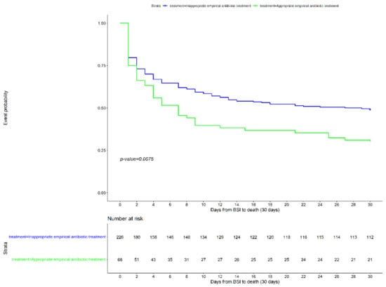 Kaplan–Meier survival analysis of patients with Pseudomonas aeruginosa bacteremic pneumonia, stratified by the appropriateness of empirical treatment.