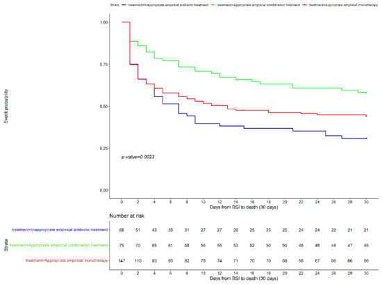 In addition, when focusing on the impact of the three treatment strategies, we observed that the benefit on survival of the administration of an appropriate empirical combination treatment was maintained after adjusting for potential confounders (aHR 0.46 [95%CI 0.27–0.78]; p = 0.004). The univariate and multivariate Cox models are detailed in Table 3 and Table 4). Figure 1 and Figure 2 show the Kaplan–Meier curves stratified by the appropriateness of empirical treatment.