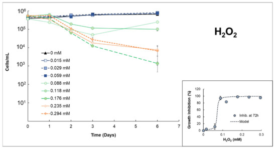 Growth curves of Anabaena sp. after adding different concentrations of H2O2. Inset: Growth inhibition rate at 72 h for Anabaena sp. exposed to H2O2. The line plotted corresponds to the fit of the model used (see Section 2.3. Data treatment).