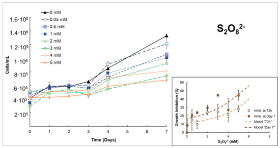 Growth curves of Anabaena sp. after adding different concentrations of S2O82− (PDS). Inset: Growth inhibition rate for Anabaena sp. exposed to S2O82− on specific days 3 and 7. The plotted line corresponds to the fit of the model that was used (see Section 2.3. Data treatment).