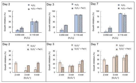 Additionally, it would also involve the precipitation of iron hydroxides. In this regard, occasional measurements of dissolved iron were performed, which decreased up to 0.33–0.42 mg Fe/L within the first 24 h. It might entail heterogeneous Fenton-like reactions in the bulk to some extent and especially in the case of H2O2 [22]. On the other hand, an extracellular iron reduction from Fe(III) to Fe(II) could also occur facilitated by a specific outer membrane transporter on the cell surface or siderophore or other DOM-mediated mechanisms in the cultures [44,45,46], which could maintain the residual levels of dissolved Fe detected. These possible pathways were perhaps responsible for the enhanced growth inhibition at longer exposure times, specially for S2O82− (Figure 3).