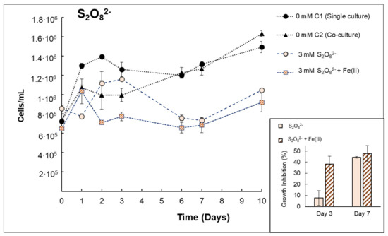 Growth curves of Anabaena sp. in co-culture with V. alginolyticus for single S2O82− or S2O82− + Fe(II) treatments. Inset: Specific growth inhibition (%) obtained on day 3 or 7 for Anabaena sp.
